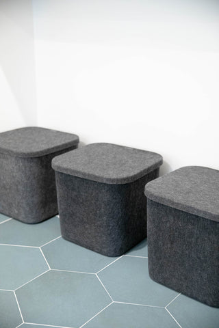 Bins with lids are a smart addition to any entry. Covered storage makes it easy to create a streamlined home for shoes or seasonal accessories that looks polished — without investing in a piece of closed furniture.